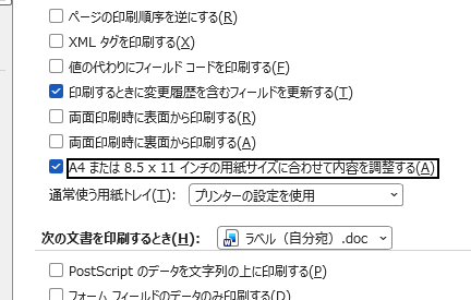 どうしたものかと、ラベルサイズに合わせて新しいWordのファイルをつくりなおして、それで印刷しても・・・やっぱしズレてる!なんか勝手にサイズを縮小している!
